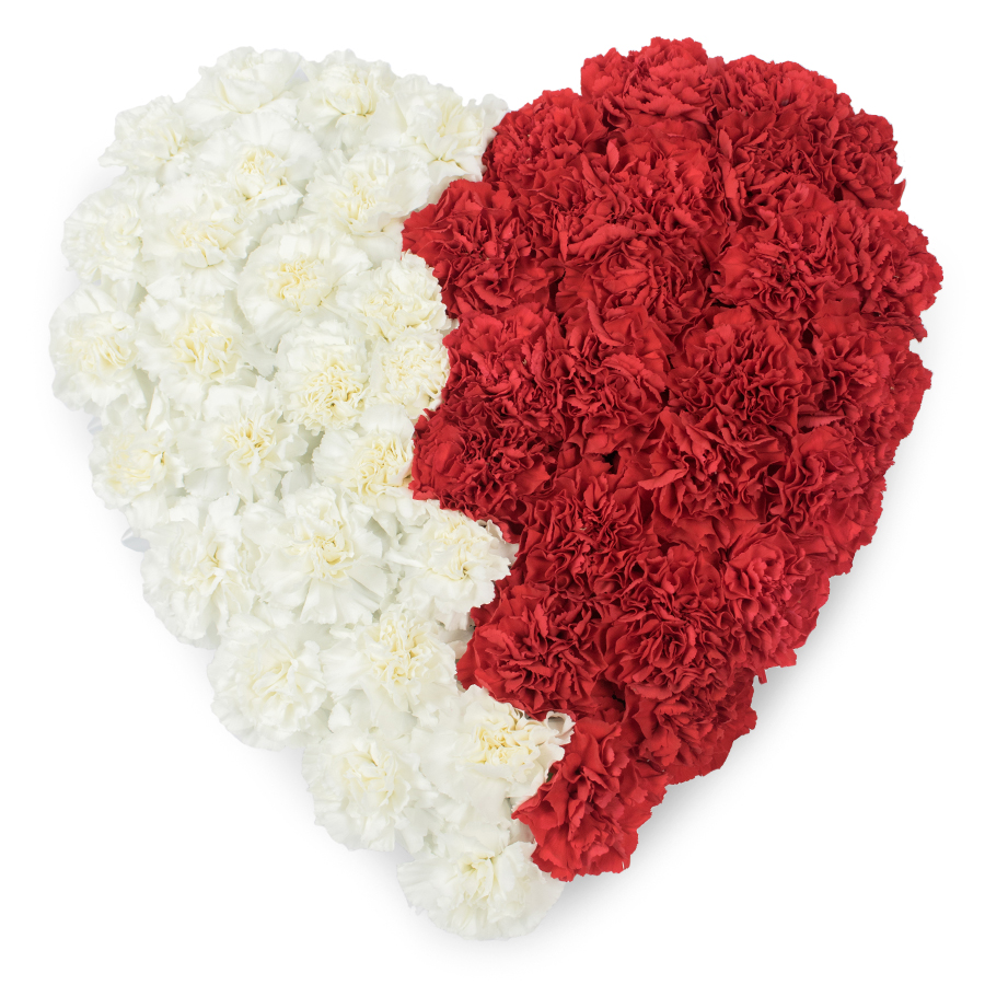 Celebrate love and sympathy with our Elegant Red & White Heart Bouquet by Handy Flowers. This stunning arrangement features a perfect blend of white and red carnations, meticulously arranged into a heart shape that radiates beauty and emotion.